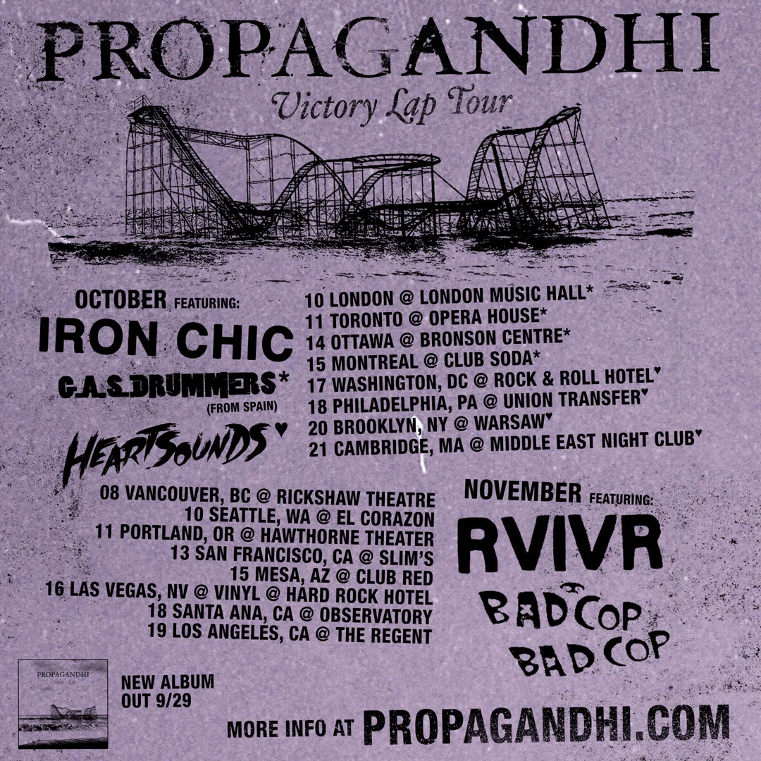 We're excited to announce tour dates in US and Canada for Propagandhi. Their wildlyanticipated release, Victory Lap, is out 9/29. Don't miss their formidable rock show coming to a city near you. Tickets go on sale Friday.